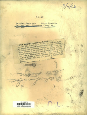 Married Teen Age - Scott Feature - Mr. and Mrs. Courtney Young Jr. and son, Greg, are one of the student families who are commonplace on college and university campuses. They were recently chosen to be pictured in an Emma Willard School brochure which is being prepared in connection with a fund-raising appeal. Mr. Young is a graduate student at Union College and instructor at Emma Willard. His wife is a senior at Russell Sage College.