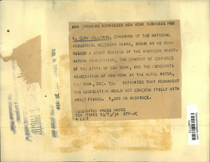 S. Clay Williams, Chairman of the National Industrial Recovery Board, shown as he addressed a joint session of the American Arbitration Association, the Chamber of Commerce of the State of New York, and the Merchants Association of New York at the Hotel Astor, New York, December 13. Intimated that permanent National Recovery Administration (NRA) legislation would not concern itself with price fixing. 1,200 in audience.