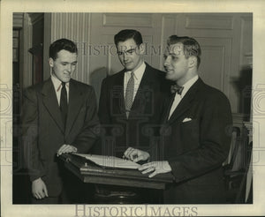 Barr S. Morris, right, Albany senior at Colgate University, is shown with aides, Harvey W. Zorbaugh, left, and Robert A. West, as they complete plans for a Careers Conference to take place Tuesday at the college. Mr. Morris is president of the Forum of Colgate University students, sponsors of the session. More than 20 speakers will take part in the one-day conference, designed to help undergraduates make a deliberate choice of a career.