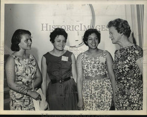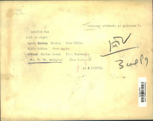 Exchange students at Governor's mansion tea, Albany, New York - left to right: Agnes Smolcz from Chile, Maria Pablos from Spain, Mariam Lemus from Guatemala, and Mrs. Cortland Van Rensselaer Schuyler (tea hostess)