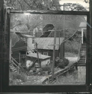 1957 Press Photo View of alley through broken window in Watervliet, New York