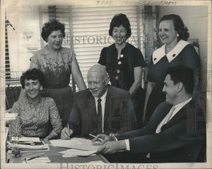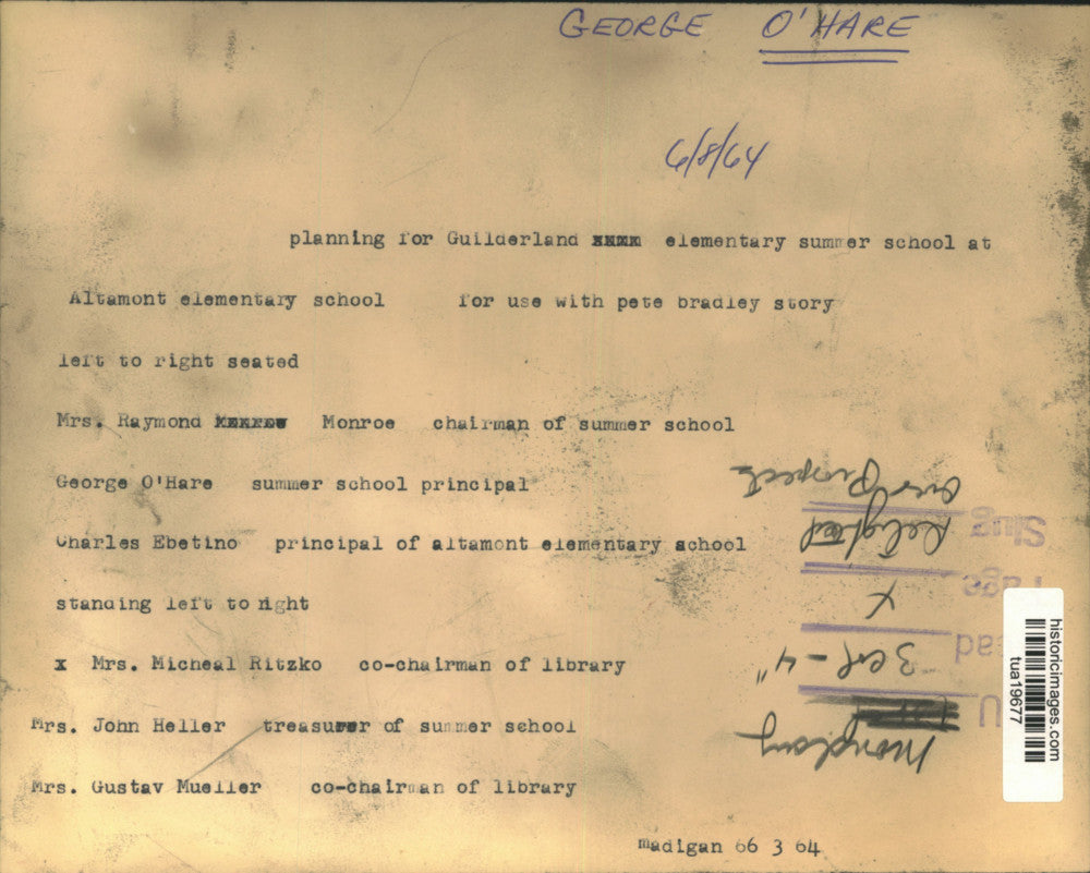 Planning for Guilderland, New York elementary summer school at Altamont elementary school - seated, left to right: Mrs. Raymond Monroe, chairman of summer school; George O'Hare, summer school principal; Charles Ebetino, principal of Altamont elementary school - standing, left to right: Mrs. Michael Ritzko, co-chairman of library; Mrs. John Heller, treasurer of summer school; Mrs. Gustav Mueller, co-chairman of library