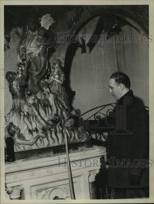 Reverend Emery Parillo, Assistant Pastor of Our Lady of Mt Carmel Church, Watervliet, New York, inspects fire damage on sculpture.