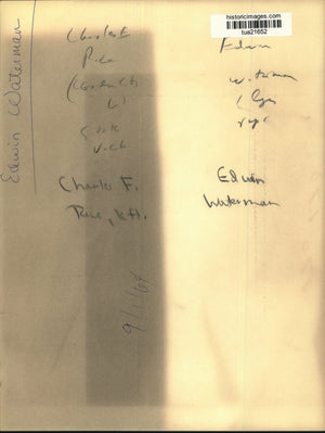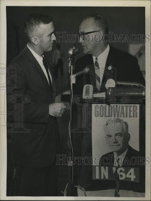 Charles F Rice talks with Edwin Waterman, behind podium with a "Goldwater in '64" poster on it