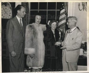 Newbold Morris (L) meets with Mrs Mary Nelson, 409 State Street, State Health Department; Leona Hudson of Buffalo, New York; and General John J Bradley in an office for a trophy presentation.