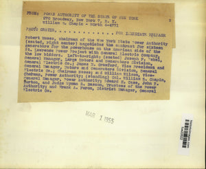 Rogert Moses, chairman of the New York State Power Authority (seated, right center) negotiates the contract for sixteen generators for the powerhouse on the American side of the St Lawrence Power Project with General Electric Company, the low bidders. Left to right seated: Joseph F Eckel, James M Crawford, Chairman Moses, William Wilson. Standing: Colonel William S Chapin, Edward H Case, John F Burton, Judge Wyman S Bascom and Frank A Faron