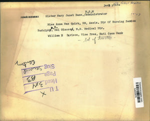 St. Peter's Hospital, Albany, New York -= Sister Mary Janet Bane, RSM, Administrator; Miss Anna Mae Quirk, RN, Assistant Director of Nursing Service; Rudolph R. Del Giacco, MD, Medical Director; William E. Davison, Vice President, National Commercial Bank, Board of Trustees