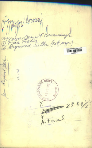 Politicians at ribbon-cutting ceremony in New York - Albany Mayor Erastus Corning, Watervliet Mayor James F. Cavanaugh, Fred Fields, and City Manager Watervliet Raymond Selke