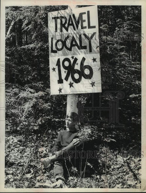 1965 Press Photo Ed Crowley Jr, age 14, sits beneath Op Art sign in New York