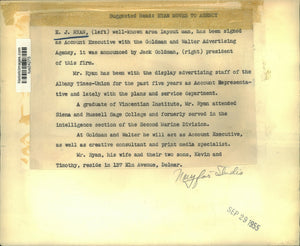 Albany, New York - E.J. Ryan (left) well-known area layout man, has been signed as Account Executive with the Goldman and Walter Advertising Agency, it was announced by Jack Goldman (right) president of this firm. Mr. Ryan has been with the display advertising staff of the Albany Times-Union for the past five years as Account Representative and lately with the plans and service department.