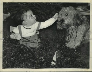 1971 Press Photo Baby and dog sit in pile of audio tape in Albany, New York