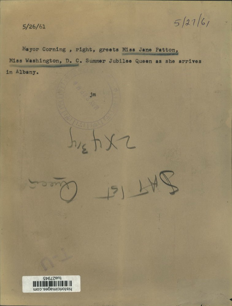 Mayor Erastus Corning, right, greets Miss Jane Patton, Miss Washington, DC Summer Jubilee Queen, as she arrives in Albany, New York