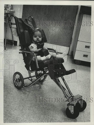1977 Press Photo Pamela Lynch in special chair at St. Margaret's, Albany, NY
