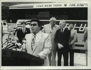 Louis A Magnano, president Bluebird Bus Company, speaks at press conference promoting New York Tourism as Assemblyman Matthew Murphy, chairman, tourism, sports and arts assembly; and New York Governor Hugh Carey listen at the Empire State Plaza
