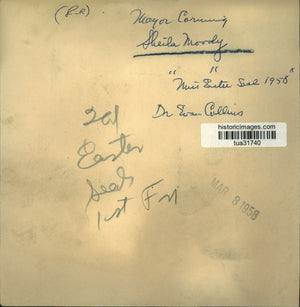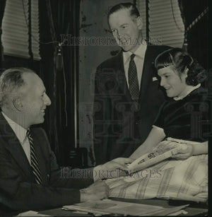Albany New York Mayor Corning meets Sheila Moody, Miss Easter Seal 1958, as Dr Evan Collins watches.