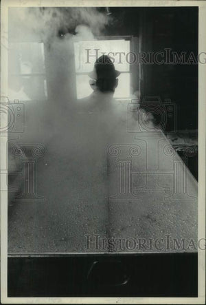 1972 Press Photo Man watches steam evaporate from pot during Maple Sugaring