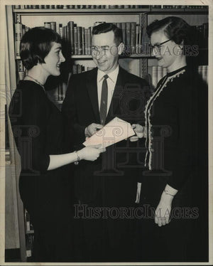 New York - Miss Tricia Leonard, at left, president of the Evening Students Association of Russel Sage College, presents scholarship certificates for the spring term to Miss Kathleen Kelly, 313 State Street, and Andrew S. Krieger of Troy. The scholarships, donated by the association, were based on academic standings in the fall term. Other recipients were John S. Rowan of Cohoes and Miss Dorothy Lovelock of Earlton