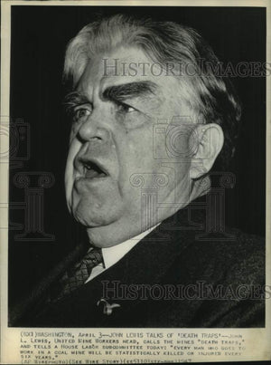 Washington, DC - John L. Lewis, United Mine Workers head, calls the mines "death traps," and tells a house labor subcommittee today: "Every man who goes to work in a coal mine will be statistically killed or injured ever six years."