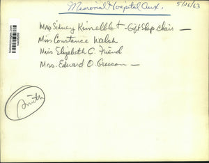 Auxiliary staff with sundries cart at Memorial Hospital in Albany, New York - Mrs. Sidney Kimelblo, Gift Shop Chair, Miss Constance Walsh, Miss Elizabeth C. Friend, and Mrs. Edward O. Greeson