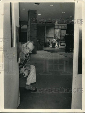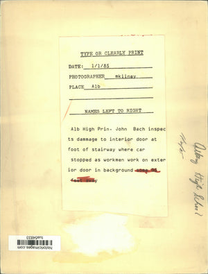 Albany High School, New York - Principal John Bach inspects damage to interior door at foot of stairway where car stopped as workmen work on exterior door in background