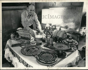 1972 Press Photo Michael Korhun with wood carvings in his New York home