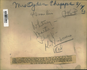 New York - Looking over a brochure describing the Saratoga Performing Arts Center are, left, Mrs. john Hay Whitney, Charles E. Mather 2d and Mrs. Ogden Phipps. Mr. & Mr.s Mather and Mr. and Mrs. Phipps gave a luncheon Monday at the Saratoga Golf Club where socialites and leaders in racing circles heard State Conservation Commissioner Harold G. Wilm tell of plans for the Performing Arts Center and ask for financial aid. The Social Whirl, at left, tells more about the luncheon