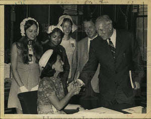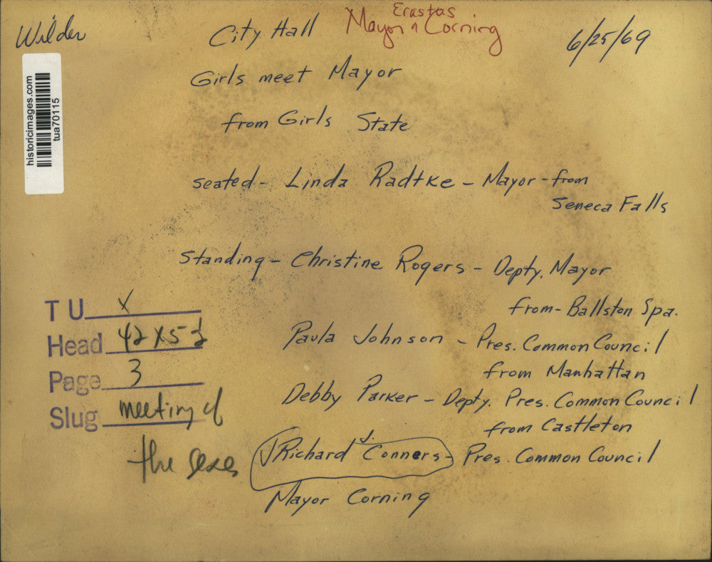 City Hall, Albany, New York - Girls meet Mayor from Girls State - seated: Linda Radtke, Mayor from Seneca Falls. Standing: Christine Rogers, Deputy Mayor from Ballston Spa; Paula Johnson, President of Common Council from Manhattan; Debby Parker, Deputy President of Common Council from Castleton; Richard J. Connors, President of Common Council; Mayor Erastus Corning