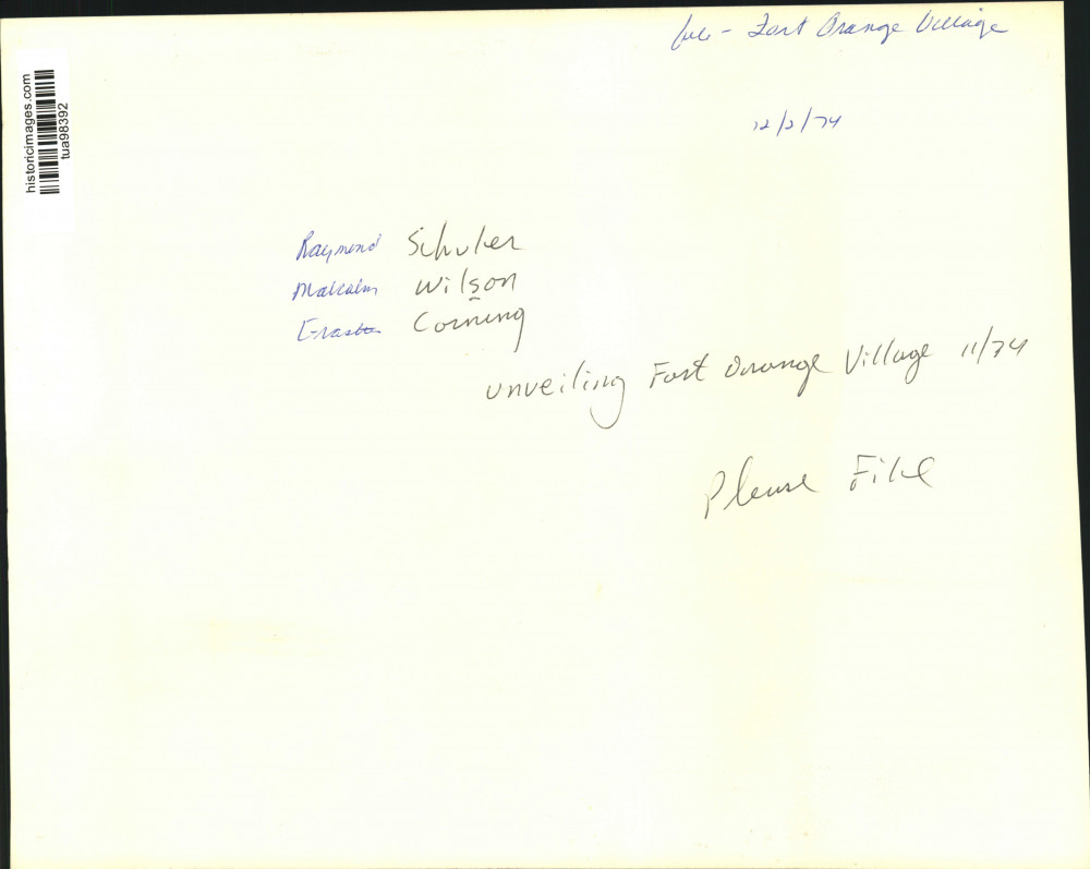 Raymond Schuler, Malcolm Wilson, Erastus Corning unveiling Fort Orange Village