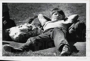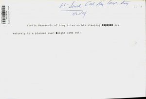 South End Day Camp, Troy. Curtis Hayner, 8, of Troy tries on his sleeping prematurely to a planned overnight camp-out.
