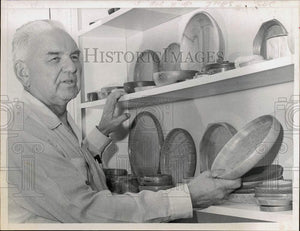 1966 Press Photo Dr. C.M. Suter Shows Display of Finished Wood Plates and Bowls