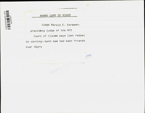Judge Harold Koreman at Erastus Corning Funeral, Albany, New York. Judge Harold E. Koreman, presiding judge of the New York State Court of Claim pays last respects to Corning -- moth men had been friends over 40 years.
