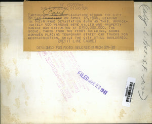 San Francisco Disaster. Earthquake and conflagration struck the city of San Francisco on April 18, 1906, leaving in their wake devastation such as this. Approximately 500 persons were killed and property damage was estimated at $350,000,000. the scene, taken from the ferry building, shows workmen placing temporary street car tracks for reconstruction, while the city still smoldered.