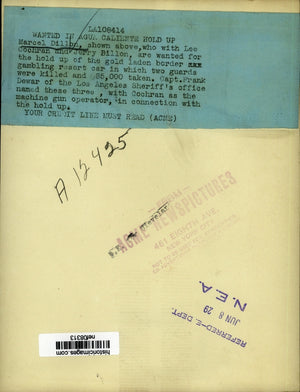 Marcel Dillon, shown above, who with Lee Cochran and Jerry Billon, are wanted for the hold up of the gold laden border gambling resort car in which two guards were killed and $85,000.00 taken. Captain Frank Dewar of the Los Angeles Sheriff's office named these three, with Cochran as the machine gun operator in connection with the hold up.