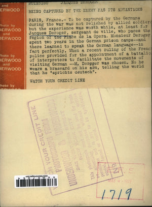 Paris, France - To be captured by the Germans during the war was relished by allied soldiers but the experience was worth while, at least for Jacques Deroger, sergeant de ville, who paces the region of the Place de la Opera. Monsieur Deroger spent two years in the German prison camps -- and there learned to speak the German language -- in fact perfectly. When a recent ruling of the French police provided for the appointment of a battalion of interpreters to facilitate the movements of visiting German -- M Deroger was chosen. No he wears a brassard on his arm, telling world that he "sprichts deutsch".