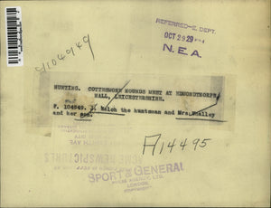 J. Welch the huntsman and Mrs. Whalley and her son - Cottesmore hounds meet at Edmondthorpe Hall, Leicestershire