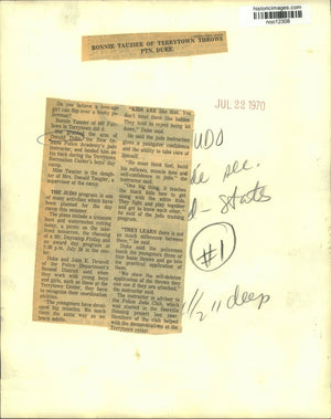 Do you believe a teen-age girl can flip over a husky policeman? Bonnie Tauzier of 507 Fairlawn in Terrytown did it. She grabbed the arm of Donald Duke, the New Orleans Police Academy's judo instructor, and landed him on his back during the Terrytown Recreation Center's boys' day camp.