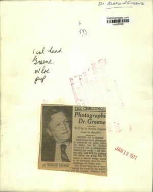 Dr. Richard Greene. Photographic...Dr. Greene. Will Be in Action Against Aces in Benefit. Second of a Series. Some people have photographic memories for dates, others for music, but Dr. Richard Greene has a photographic memory for cards - the playing kind. And he'll be pressing this ability into action February 5-7 during a special bridge match at the Rivergate when his team challenges the Dallas Aces. The Times-Picayune is sponsoring the event for the benefit of the Crippled Children's Hospital.