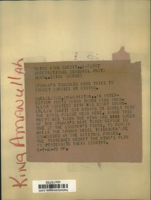 An interesting photo which shows King Amanullah (center) with his Court Chamberlain (left) out riding on camels from the Royal Palace near here. Since this photo was taken the King and Queen of the Afghan's have taken refuge in one of the country's forts, to remain wile the Afghan rebel tribesmen are conquered by the National Forces. The Tribesmen resent the King's plan to westernize their country.