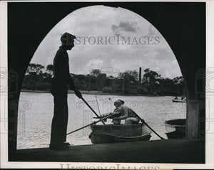 Ruckstastter and his father George in rowboat prepare to launch a model sailboat
