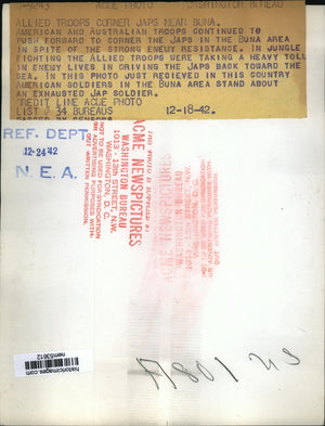 American and Australian troops continued to push forward to corner Japanese in the Buna area in spite of the strong enemy resistance. In jungle fighting the Allied Troops were taking a heavy toll in enemy lives in driving the Japanese back toward the sea. In this photo just received in this country American soldiers in the Buna stand about an exhausted Japanese soldier.