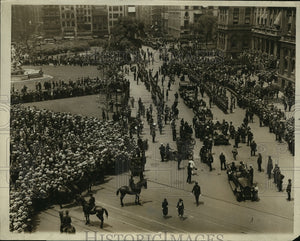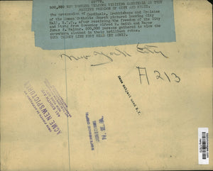 THE PROCESSION OF CARDINALS ARCHBISHOPS AND PRELATES OF THE ROMAN CATHOLIC CHURCH PICTURED LEAVING CITY HALL NYC AFTER RECEIVING THE FREEDOM OF THE CITY AND STATE FROM GOVERNOR ALFRED E SMITH AND MAYOR JAMES J WALKER. 500,000 PERSONS GATHERED TO VIEW THE CHURCHMEN CLOTHED IN THEIR BRILLIANT ROBES.