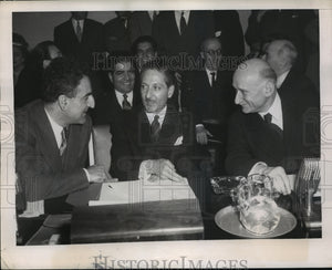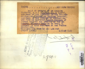 Charles Malik on left chairman of the Lebanese UN delegation, Nasrollah Entezam in center chairman of Iranian UN delegation and Foreign Minister Robert Schuman of France meet at opening of the UN General Assembly session on April 5. Schuman is also chairman of the French delegation