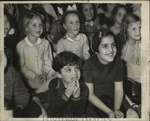 A STUDY IS PRESENTED BY THE YOUNGSTERS AS THEY WATCH ST NICHOLAS PATRON SAINT OF CHILDREN AND KNOWN TO THE DUTCH AS SINTERKLAAS AS HE ARRIVED AT THE CELEBRATION OF ST NICHOLAS EVE IN THE BANQUET HALL AT THE HOLLAND HOUSE, ROCKEFELLER PLAZE DEC 5TH. ST NICHOLAS BROUGHT PRESENTS FOR THE TWO HUNDRED DUTCH CHILDREN MORE THAN HALF OF THEM WAR REFUGEES FROM HOLLAND WHO ATTENDED THE PARTY.