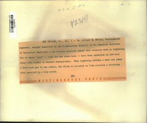 New Orleans, Louisiana, December 3 - Dr. Gilbert D. McCann, Westinghouse engineer, tonight described to the Southeastern District of the American Institute of Electrical Engineers a new battery-operated camera that collects data on lightning. Ten of these "eyes" - like the one shown here - have been installed on 100-foot state fire towers in western Pennsylvania. When lightning strikes a mast and jumps a half-inch gap in the camera, the flash is recorded on film covering a revolving disk operated by a tiny motor.