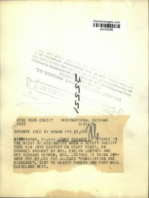 Jimmy Durante being held in custody on court order, on charges brought by Mrs. Evelyn Loether and her husband Herman.
