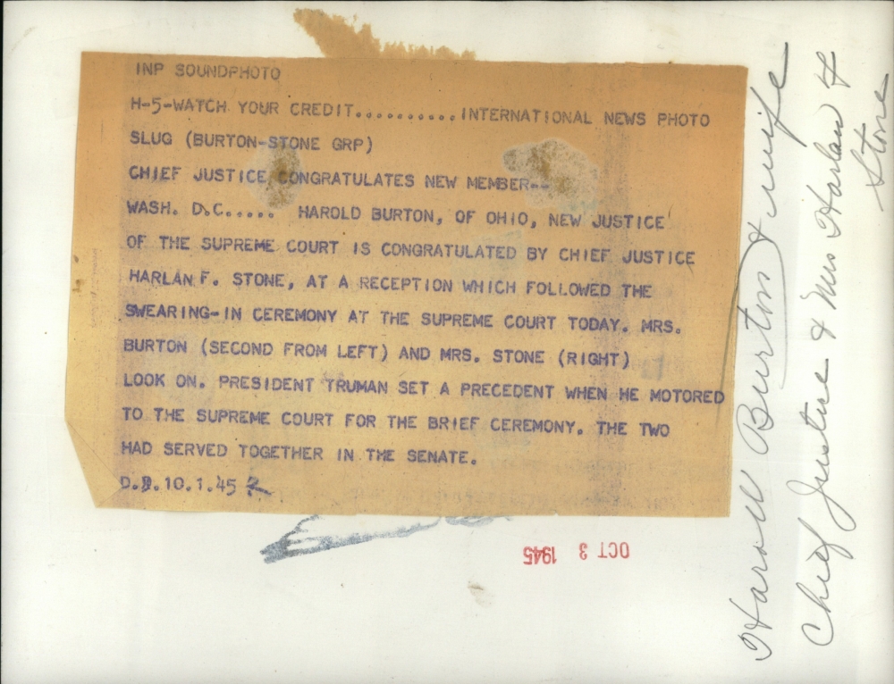 1945 Press Photo Justice & Mrs Harold Burton, Chief Justice & Mrs Harlan F Stone