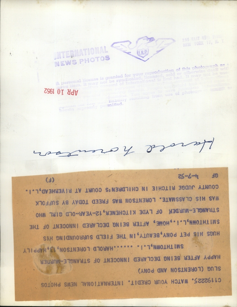 1952 Press Photo Harold Lorentson and pony after his absolvement of murder