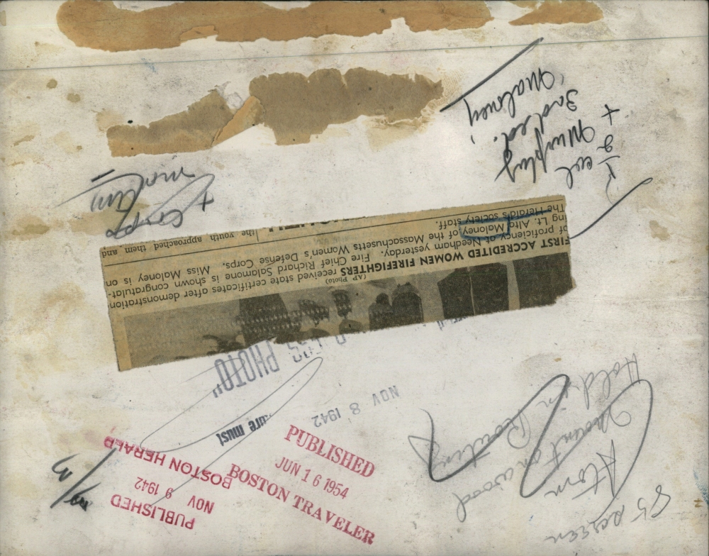 Fire Chief shown congratulating Lt. Maloney of the Massachusetts Women's Defense Corps. Photo measures 9 x 7 inches. Photo is dated 11-08-1942.