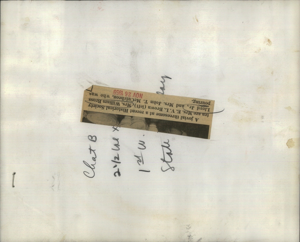 A jovial threesome at a recent Historical Society tea are Mrs. E.V.L. Brown (left) Mrs. William Bross Lloyd Jr., and Mrs. John T. McCutcheon, who was pouring.