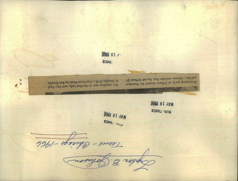 Welcoming party at O Hare Airport for President and Mrs Johnson includes Rep Barratt O Hara standing next to Senator Paul H Douglas Photo by Bob Kotalik